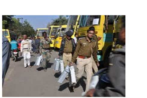 Today Police officials carried Electronic Voting Machines (EVMs) before leaving for different booths in 3rd phase of Jharkhand Assembly election in 17 constituencies in the state including Ranchi.
